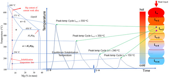 Schematics of multiple thermal cycles in multi-layer WAAM of a thin wall and of the peak temperatures and the corresponding temperature in a phase diagram of an Al–Mg 5% alloy (where L stands for layer and n for the sequential position of the layer).