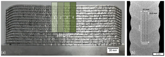 The metallurgical evaluation of samples from the wall, as illustrated in Figure 7a, was carried out via metallographic examination (optical microscopy) and microhardness profiling. After cutting, grinding, and polishing the transverse cross-sections, a 1.5 mm × 6 mm Vickers microhardness map was initially swept in the mid-height of the cross-sections of each sample (as shown in Figure 7b). The dimension of 6 mm was selected to make it possible to analyse two completed layers and one interlayer region (given a maximum layer height obtained of 2.6 mm). It is important to note that in parts manufactured with WAAM, as long as an interlayer temperature is adopted and maintained throughout the deposition for the same parameter conditions, the same microstructural and hardness behaviour is expected throughout the entire central height region of the wall. The indenter employed a load of 200 gf for 15 s, with a distance between indentations of 0.5 mm and 0.25 mm in the horizontal and vertical directions, respectively. After the microhardness test, the samples were etched in a solution of 20% HF + 80% H2O, for an immersion time of 35 s. Subsequently, a macrograph of the entire wall and micrographs at various magnifications from distinct regions of the wall were captured utilising an optical microscope.