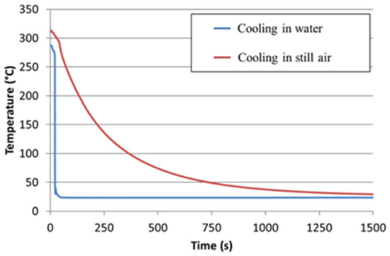 Monitored temperatures during cooling of the in-furnace samples, quenched from 300 °C × 10 min in water and still air.