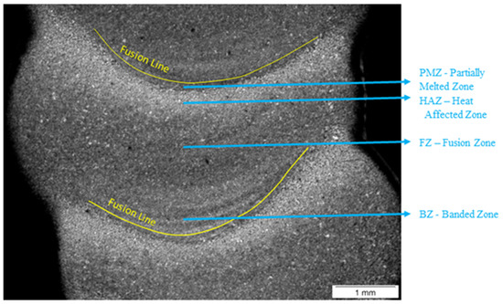 The band of coarser particles below the fusion line, on the other hand, means a material region reheated at very-high peak temperatures for the alloy, ranging from approximately 585 °C and 630 °C, due to the subsequent layer deposition. In this temperature range, liquid and α-phase co-exist at the end of the heating. This α + L temperature range (Figure 1) characterises the partially melted zone (PMZ).