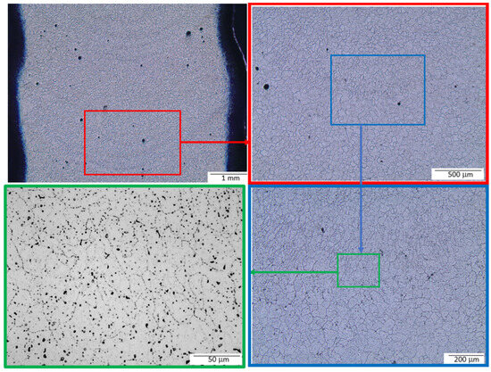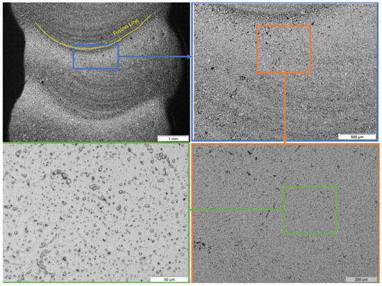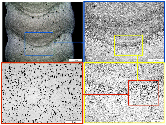 Micrographs with progressive magnification from the transition between layers at the wall half-height after post-heat treatment at 500 °C for 10 min and cooled in water.