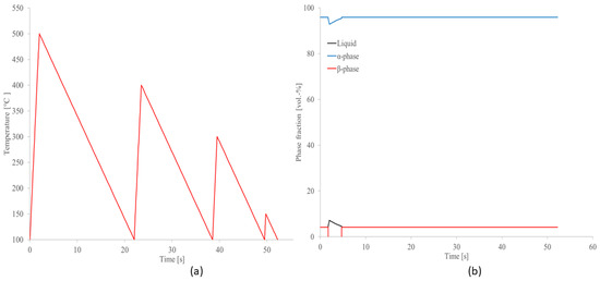 (a) Programmed simulation of the cycled thermal cycles, with a heating rate of 200 °C/s and cooling rate of 20 °C/s. (b) Phase fraction as a function of time for the cyclic DICTRA simulation.