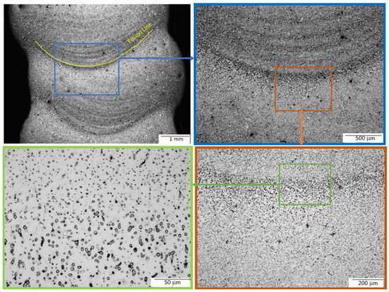 OM micrographs with progressive magnification from a layer sample at the wall half-height layer in an as-deposited condition (without post-heat treatment), highlighting the HAZ (heat-affected zone).