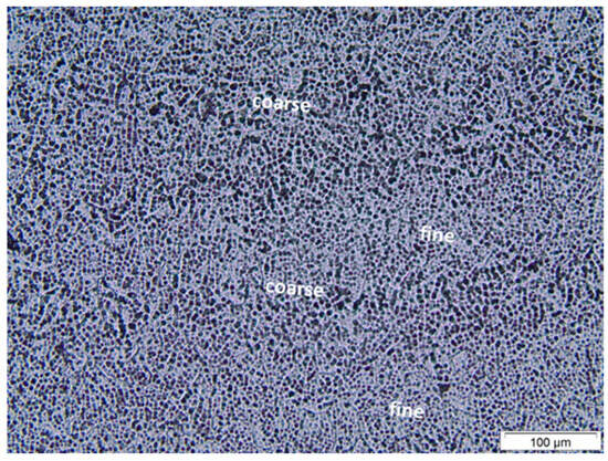 OM microstructure of the BZ (banded zone—Figure 11), sampling a layer at the wall half-height in an as-deposited condition (without post-heat treatment), revealing the solidification banding (fine and coarse dendrites or cells and eutectics) due to thermal pulsation.