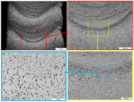 First of all, one must keep in mind that all layers in this work were deposited with the same parameters and at the same condition. Then, the same layer and pool sizes (widths and heights) were expected in the building direction. That being said, a microstructure variation that occurred only between the top layer (the last deposited layer), maybe also at one or two layers below the top one, and the preceding layers (the numerous previous layers) is easily understood, considering the potential effect of the subsequent thermal cycles on the earlier layers. However, the results showed that in each of the layers which were heat-treated by the multiple thermal cycles, when using a pulsing-like energy heat source (see Figure 5), more than the traditional heat-affected zone effect on the previous pass, as in arc welding, occurred. That is, a thin wall built up with AlMg5 via WAAM presented unique microstructural-related regions, as illustrated in Figure 11. Each of the zones presents a particular morphology characteristic.