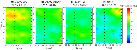Hardness maps taken from the samples of the wall at a half-height layer that either underwent or did not receive a post-heat treatment (HT) at different peak temperatures and cooling media (WC stands for water cooling and SA stands for still air cooling).