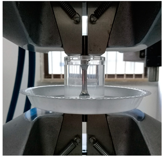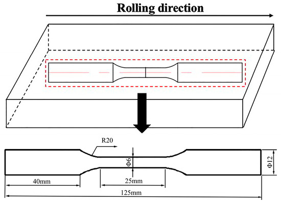 The cylindrical fatigue sample of 25 mm gauge length with 6 mm gauge diameter, prepared from the plate along the rolling direction, is illustrated in Figure 1. According to the Chinese Standard GB/T 3075-2021 (ISO 1099-2017) [26], the low-cycle fatigue (LCF) in laboratory air (LA) and low-cycle corrosion fatigue (LCCF) tests in 3.5% NaCl corrosion solution (CS) (SHANGJI Co., Nanjing, China) were carried out on the MTS 810 servo hydraulic machines (MTS Co., Shanghai, China) under the stress control with a triangular waveform, a stress ratio of R = −1, and a frequency of f = 0.5 Hz. Based on the tensile stress–strain curve, the stress amplitudes (Δσt/2) including 650 MPa, 690 MPa, 750 MPa, 880 MPa and 910 MPa were selected for fatigue tests. For LCCF tests, the PH value of the used 3.5% NaCl solution was determined as 8.6 by a pH meter (DEYI Co, Shenzhen, China). According to the actual operation and requirements of this experiment, a solution container and device used in LCCF tests are shown in Figure 2. Three parallel samples were used in LCF tests in LA and CS under each stress amplitude. All fatigue tests were conducted at room temperature (about 25 °C).