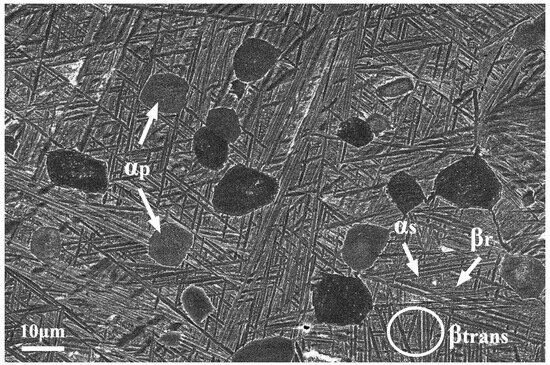 The duplex microstructure obtained by the heat treatment above is shown with a SEM image in Figure 3. It is composed of primary equiaxed α phase (αp, size ~6.43–14.89 µm), transformed β matrix (βtrans) consisting of secondary α (αs) with a thickness of ~0.50–1.16 µm and a thin residual β phase (βr).