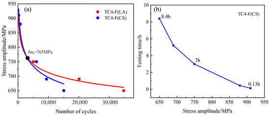 Stress amplitude vs. number of cycles for TC4-F alloy in LA and CS (a); testing time for TC4-F alloy in CS (b).