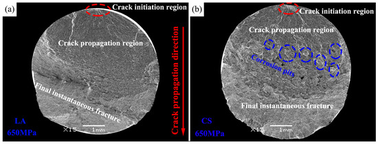 SEM images of fracture morphology for TC4-F alloy under the stress amplitude of 650 MPa: (a) in LA; (b) in CS.