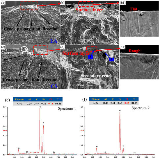 It is certain that the distinctive mechanisms of fatigue crack initiation and propagation behavior lead to the different features on the fracture surface of TC4-F alloy in LA and CS. Figure 7 exhibits the fatigue crack initiation regions of samples in LA and CS at a high magnification region. For the sample in LA, only one fatigue crack initiation site is observed in Figure 7a, and the fatigue crack initiates from the sample surface with crystal facets associated with slip bands (Figure 7a,b) due to the activation of slip bands on the sample surface caused by applied cyclic reversal load. Usually, the size of the grain where the crack initiation occurs is larger than the average grain size [32]. For the sample in CS, the observation in fractography shows the corrosion product and characteristics of multiple crack sites (Figure 7c), which indicates that the superimposed effect of fatigue and corrosion accelerates fatigue crack initiation. In addition, compared with the flat layer in LA (Figure 7b1), the surface layer of the fatigued sample in CS turns out to be rough and forms a corrosion layer (Figure 7d1). As shown in Figure 7e,f, EDS analysis for the chemical composition of Spectrum 1 and Spectrum 2 detects the presence of elemental Cl in the crack initiation site and CPs. During cyclic load, tiny CPs at the surface corrosion scale induce the stress concentration, which causes serious corrosion damage, promotes the fatigue crack initiation, and finally shortens fatigue life [18].