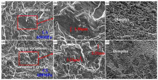 Figure 9c,f give the surface damage area at the junction of the crack propagation region and instantaneous fracture region. Surface damage morphologies of samples in LA and CS show obvious characteristics of plastic deformation at the crack tip and cracking along the slip. Secondary cracks are observed on the surface in LA. In this process, the stress intensity factor range ΔK [35] of the TC4-F alloy sample in CS is high with the corresponding high crack growth rate, causing the short fatigue life and loading time, which makes cyclic plastic deformation play a dominant role. In addition, this area in the fracture surface of this alloy in LA and CS shows sudden static failure with appreciable plastic deformation [36].