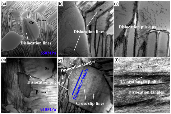 The dislocation characteristics of TC4-F alloy samples after cyclic deformation in CS under stress amplitudes of 650 MPa and 910 MPa examined by TEM are given in Figure 11. It can be seen that cyclic deformation mainly occurs in αp grains because they have a softer phase than βtrans [37]. Under a low stress amplitude of 650 MPa, dislocation structures are dominated by simple short dislocation lines mainly activated in αp grains with preferential orientation, and few are detected in the αs phase (Figure 11a,b). Short dislocation lines pile up in α/β interfaces (Figure 11c), which means that dislocation interaction occurs in the vicinity of α/β interfaces. Due to the low applied stress close to the elastic region, no significant macro plastic deformation occurs in the deformed sample. Then, only micro yielding takes place by dislocation interaction [38]. Under a high stress amplitude of 910 MPa, more complex dislocation structures with high dislocation density are activated to accommodate the cyclic plastic deformation, which indicates that multiple slip systems occur in a deformed sample. Dislocation tangles are observed in both the αp grain and the αs phase (Figure 11e,f), caused by the dislocation pile-ups and dislocation interaction in α/β interfaces. Furthermore, a dislocation band and cross slip lines form inside the αp grain (Figure 11e). It was reported that the dislocation band is strongly related to the prismatic slip [39], while crossing slip lines are dominated by prismatic <a> slips and pyramidal <c + a> slips [40]. Additionally, dislocations are detected clearly in the β phase (Figure 11f). Also, a large number of dislocations easily activated inside αp grain would pile up in α/β interface due to high plastic strain. As a result, the main deformation mechanisms of this alloy in CS are cross slips and dislocation tangles.