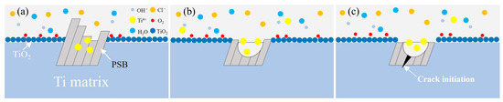 Schematic illustration of corrosion fatigue damage mechanism for TC4-F alloy under high stress amplitude: (a) PSB caused by high applied stress; (b) the passivation film was destroyed by slip, and anodic dissolution in the matrix occurs [42]; (c) fatigue crack initiation occurs on the surface of sample due to stress concentration.
