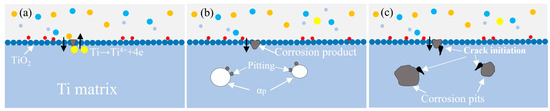 Schematic illustration of corrosion fatigue damage mechanism for TC4-F alloy under low stress amplitude: (a) Cl− pass through the broken passive film (black arrows); (b) corrosion products form on the surface and pitting corrosion occurs; (c) fatigue initiation is accelerated, and corrosion pits form.