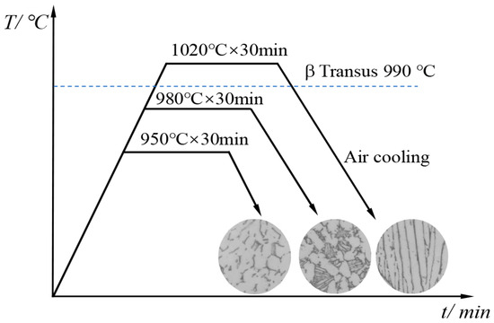 The original material used in this study is the hot-rolled Ti-5111 alloy with a chemical composition of Ti-5.11Al-1.02Sn-0.98V-1.12Zr-0.84Mo. The β phase transition temperature of the alloy is 980 ± 5 °C, measured by the metallographic method. Three heat treatments were conducted on the hot-rolled Ti-5111 alloy for obtaining Ti-5111 alloys with an equiaxed microstructure (EM), bimodal microstructure (BM) and lamellar microstructure (LM), respectively. Figure 1 presents a schematic diagram illustrating the heat treatment processes to achieve the three typical microstructures. Heat treatments were performed with the following parameters: 900 °C × 0.5 h/AC, 980 °C × 0.5 h/AC and 1020 °C × 0.5 h/AC. The argon was used as a protective gas to prevent high-temperature oxidation during the heat treatment.