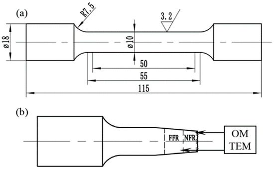 Ti-5111 alloys with different microstructures were processed into standard room temperature tensile specimens with the detailed parameters, as shown in Figure 2a. The tensile tests were conducted using a SHIMADZUAG-I250KN (Kyoto, Japan) precision universal testing machine at room temperature with a stretching rate of 1 mm/min for testing their yield strength, ultimate tensile strength, elongation and area reduction. Tensile tests of the alloys were carried out three times, and the final results were averaged. The metallographic observation was conducted by a Zeiss Axio Vert A1 microscope (Oberkochen, Germany). Before the above work, the specimens were ground successively on 180#, 240#, 600#, 800#, 1000#, 1500# and 2000# sandpaper, followed by mechanical polishing and etching with an HF:HNO3:H2O = 5:12:83 etching solution. The fracture morphology was observed using a JSM-IT100 SEM (JEOL, Tokyo, Japan) after the fractured part of the tensile specimen was soaked in anhydrous ethanol and cleaned in an ultrasonic cleaner for 10 min. The specimens near the fracture were cut into thin sheets with different sampling areas, as shown in Figure 2b. The microstructures of the near fracture region (NFR) and far fracture region (FFR) were observed using a metallographic microscope and a JEM-2100 high-resolution TEM (JEOL, Tokyo, Japan), respectively. The specimens were double-jet electrolytic-polished before TEM observation.