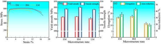Figure 3a illustrates the engineering stress–strain curves of Ti-5111 alloys with three typical microstructures. Figure 3b,c show the strength and plasticity of three typical alloys, respectively. It is known that the EM Ti-5111 alloy has a moderate strength, with a yield strength of 719 MPa and an ultimate tensile strength of 787 MPa. The elongation and area reduction of the EM alloy are 16.5% and 34%, respectively. It is noteworthy that the BM alloy is not only superior to the EM alloy in terms of strength, with a yield strength and ultimate tensile strength of 722 MPa and 801 MPa, respectively, but also exhibits superior plasticity, with an elongation and area reduction of 17.5% and 43%. In addition, the LM alloy shows the lowest strength and plasticity, with a yield strength, ultimate tensile strength, elongation and area reduction of 713 MPa, 785 MPa, 11.5% and 19%, respectively. Overall, the BM alloy demonstrates excellent comprehensive mechanical properties, compared with the EM and LM alloys. The mechanical properties of Ti-5111 alloys with three different microstructures are analyzed in detail in Section 4.
