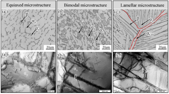 Tensile deformation microstructure of the Ti-5111 alloys: (a1,a2) NFR and FFR of the EM alloy, (b1,b2) NFR and FFR of the BM alloy, (c1,c2) NFR and FFR of the LM alloy.