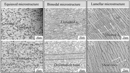 Figure 5 shows the deformation microstructure of the NFR and FFR of Ti-5111 alloys with three different microstructures. It can be seen in Figure 5(a1,a2) that some equiaxed α grains are elongated, and some αs grains show obvious bending deformation in the NFR of the EM alloy, while light deformation traces were observed in the FFR. It can also be found that small shear deformation occurs around the α/β grain boundary. Figure 5(b1,b2) show the deformation microstructure of the BM alloy. The severe plastic deformation of grains occurs in NFR, indicating that the BM alloy is more prone to dislocation slip, which is consistent with the excellent elongation found in the above tensile test results. In addition, it can be observed in Figure 5(b2) that there are long deformation bands inside the FFR of the BM alloy, while other grains do not differ much from the grains in the original microstructure. Figure 5(c1,c2) show the optical microstructures of the NFR and FFR of the LM alloy. It can be seen that the thickness of the lamellar phase grains decreases in the NFR, and the lamellar α phase grains exhibit shear deformation, as indicated by the white circles. Previous investigations have found that the parallel arrangement of α/β phase boundaries is prone to be a source of crack initiation [23], and the crack would expand rapidly along the direction perpendicular to the lamellar α phase grains [24]. This is one of the key reasons for the poor plasticity of the LM alloy. No significant plastic deformation was found in FFR; however, traces of lamellar α phase grains starting to shear were also observed.