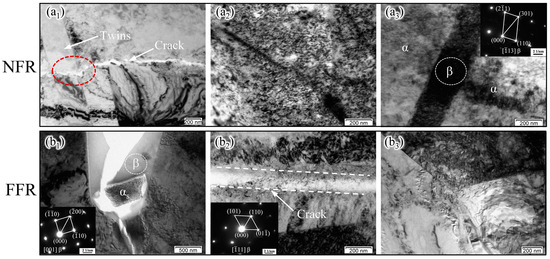 TEM tensile deformation microstructure of the BM Ti-5111 alloy: (a1–a3) NFR, (b1–b3) FFR.