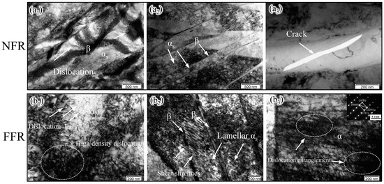 TEM tensile deformation microstructure of the EM Ti-5111 alloy: (a1–a3) NFR, (b1–b3) FFR.