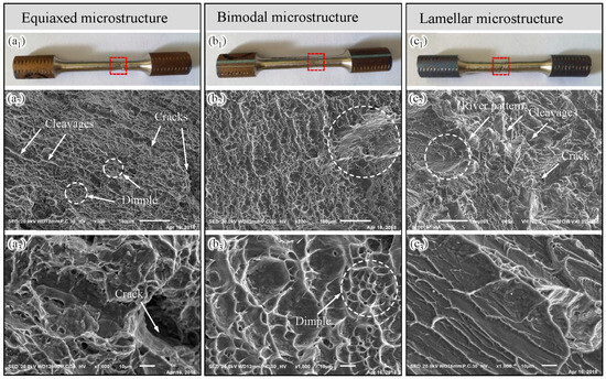 Tensile fracture morphology of the Ti-5111 alloy: (a1–a3) EM, (b1–b3) BM, (c1–c3) LM.