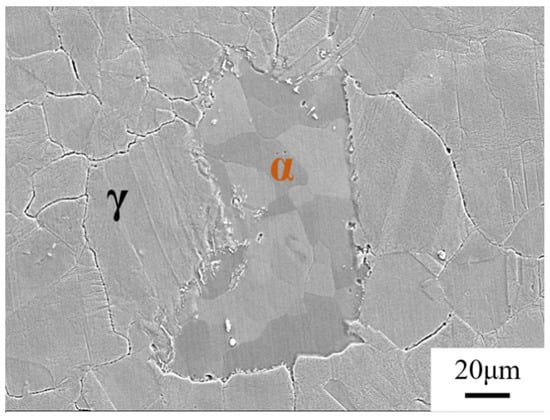 A 200 kg ingot of Fe–22Mn–9Al–0.6C steel was prepared via induction melting in an argon atmosphere, and the chemical composition was measured by titration. The ingot was soaked completely at 1100 °C for 6 h and then hot-forged into a rod of 60 mm in diameter at the temperature range of 1000 °C to 1150 °C followed by cooling to room temperature in sand. The average density of the Fe–22Mn–9Al–0.6C steel was 6.80 g/cm3, which was measured using a STARTORIU BP211D electronic analytical balance (STARTORIU Ltd., Gützenburg, Germany). Figure 1 shows an SEM image of the microstructure after hot-forging, showing that the microstructure of the hot-forged steel consists of austenite (γ) and ferrite (α).