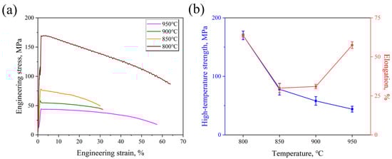 High-temperature tensile properties at deformation temperatures from 800 °C to 950 °C: (a) engineering strain–stress curves; (b) tensile stress and elongation.