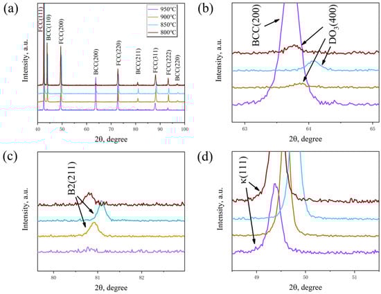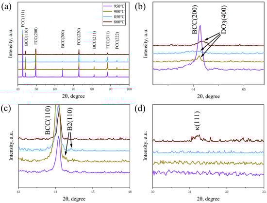 XRD intensity profiles of the solid-solution specimens at the temperatures of 800–950 °C: (a) matrix, (b) DO3, (c) B2, and (d) κ-carbide.