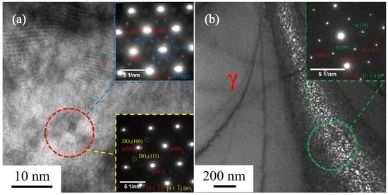 Figure 5 shows the TEM results of the microstructure near the fracture in Fe–22Mn–9Al–0.6C after high-temperature tensile tests at 900 °C and 950 °C. The incident direction of the electron beam is [01-1]. The TEM high-resolution image and selected-area diffraction (SAD, JEOL Ltd., Tokyo, Japan) patterns of the precipitates in the fractured specimen at 900 °C are shown in Figure 5a, indicating that the diffraction pattern presents the FCC structure of γ. Moreover, weak superlattice diffraction spots were detected, which were identified as B2 and DO3 after calibration. Figure 5b shows the TEM dark-field image and SAD patterns of the precipitate in the fractured specimen at 950 °C, revealing the presence of nanoscale precipitates within the γ grain boundaries, which were identified through calibration as κ-carbide. In the deformation temperature range of 900 °C to 950 °C, the transformation of secondary phases occurred, meaning that the B2 changed to κ-carbide. Combined with the XRD results, the precipitates were DO3 and κ-carbide at 800 °C; as the temperature increased to 850 °C, the κ-carbide dissolved and B2 precipitated. The presence of the B2 and DO3 remained when the deformation temperature increased to 950 °C; at higher temperatures, the DO3 and the B2 dissolved and the κ-carbide re-precipitated.