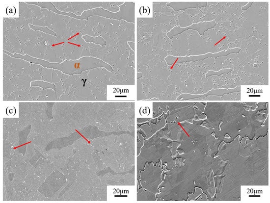 Figure 6 shows the SEM images of the microstructure in the solid-solution specimens at 800–950 °C, with a holding time of 0.5 h. It can be seen that the microstructure consists of equiaxed γ and banded α (Figure 6a–c), and all grains are equiaxed when the temperature exceeds 950 °C (Figure 6d). In addition, some discrete particles (marked by red arrows) can be observed in the microstructure at 800–950 °C.