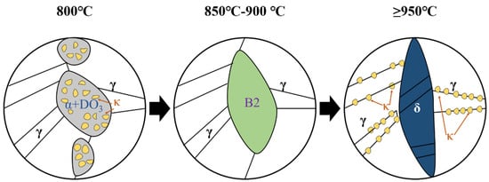 - The secondary phase transformations that occur as the temperature increases from 800 °C to 950 °C are considered to be α + DO3 + κ→B2→δ + κ in the matrix.