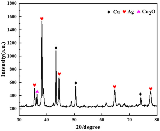 The conductive Ag pastes used for this study were obtained from Shenzhen Baoan District Shajing Xindasheng Instrument Electronic Accessories Company (Shenzhen, China). Before conducting the analysis and experiment, the sample was first poured into a surface dish and placed in a drying oven at 70 °C for 3 h to obtain the cured conductive Ag pastes. Then, the cured conductive Ag pastes were placed in a heating furnace at a high temperature of 500 °C for 2 h. Finally, the conductive Ag pastes were ground into powder form to serve as the experimental raw material for later use. Figure 1 shows the X-ray diffraction (XRD) pattern of the conductive paste. The detected phases reveal that the conductive paste mainly contained Ag, Cu, and Cu2O. Conductive Ag paste contains 21.89% Ag and 53.00% Cu.