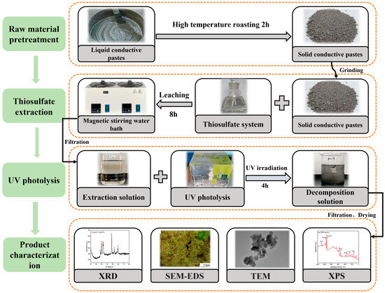 In this study, we explored a novel method to recover valuable metals from waste conductive silver pastes, i.e., thiosulfate extraction combined with UV photolysis technology, to further optimize the extraction process. In addition, through comparative analysis across various parameters, we observed that extraction and decomposition rates increase with higher concentrations of sodium thiosulfate, greater solid-liquid ratios, and elevated temperatures, and at a sodium thiosulfate concentration of 0.5 mol/L, temperature of 55 °C, and solid-to-liquid ratio of 0.1:250 g/mL, the Ag and Cu extraction rates (%) reached 100% and 86.61%, respectively. Additionally, under UV light, the Ag and Cu decomposition rates (%) reached 87.03% and 56.70%, respectively. The photolytic products were characterized using various methods. The photodecomposition products were characterized using XRD, SEM-EDS, TEM, and XPS, revealing the presence of CuS, Cu2S, Ag2S, and S. The powders existed as spherical particles with diameters in the nanometer range but tended to agglomerate easily. These results demonstrate that the use of thiosulfate in combination with UV photolysis technology can feasibly improve the metal recovery process. The use of this method can broaden the development prospects for industrial thiosulfate systems, solve the problem of environmental governance, and provide economic and environmental benefits.