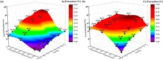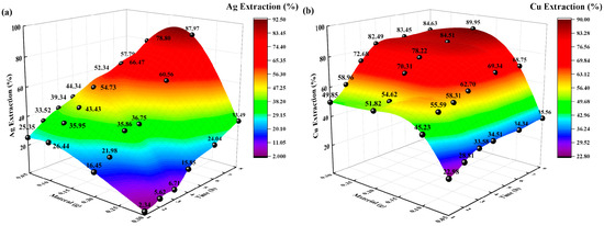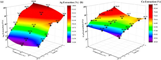 The extraction rates (%) of Ag and Cu increased with increasing temperature and time. At temperatures of 35 °C and 45 °C, the extraction rate (%) of Cu increased slowly, reaching 68% at 8 h. However, the extraction rates of Ag and Cu at 55 °C are significantly higher than those at 35 °C and 45 °C; the highest extraction rates were 100% and 86.61%, respectively. According to diffusion theory and the thermodynamic analysis of activation energy [33], as the temperature increased, the diffusion coefficient increased, the rate of diffusion of solution ions accelerated, the activation energy required for the reaction decreased, and the likelihood of a complexation reaction increased, thus increasing the Ag and Cu extraction rates. Therefore, the best temperature for Ag and Cu extraction is 55 °C.