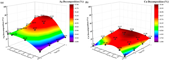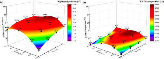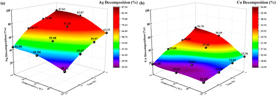 Effects of temperature on decomposition rate (%). (a) Ag decomposition rate (%) vs. time, temperature; (b) Cu decomposition rate (%) vs. time, temperature.