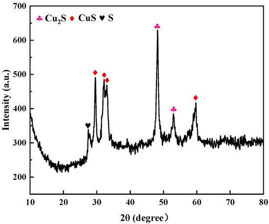 Figure 9 shows the XRD pattern of the photolytic products. In the detection range 2θ = 10–80°, the diffraction peaks located at 2θ = 48.164° and 53.557° corresponded to (103) and (112) crystal plane diffraction of the hexagonal-phase Cu2S (JCPDS card no. 99-0028) structure, respectively; the diffraction peaks located at 2θ = 29.288°, 31.793°, and 32.856° corresponded to (102), (103), and (006) crystal plane diffraction of the orthorhombic CuS (JCPDS card no. 99-0037) structure, respectively; and the diffraction peak at 2θ = 27.699° corresponded to (206) plane diffraction of the orthorhombic S (JCPDS card number: 99-0066) structure. Other miscellaneous peaks can be seen in the figure, indicating that the crystallinity of the product was poor; furthermore, there was no peak corresponding to Ag2S, indicating that there was less Ag2S in the product. SEM-EDS and TEM were used to determine the composition of the generated product.