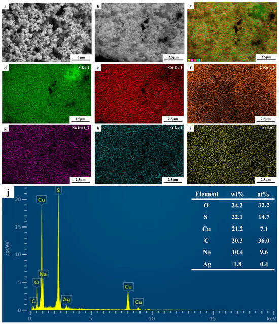The SEM images of the photolytic products are shown in Figure 10a,b. The product size was not uniform, the powder was relatively agglomerated, and the particles were spherical. To identify the types and distributions of the elements, an EDS analysis was conducted; the results are shown in Figure 10c–i. Figure 10c shows the EDS diagram for the electronic image, and Figure 10e-i shows the EDS data for S, Cu, C, Na, O, and Ag in the electronic image. The atomic ratio of S to Cu in Figure 10j was approximately 2, indicating that the aqueous solution of the thiosulfate complex can be decomposed into cuprous sulfide by UV light. However, owing to the limitations of SEM, determining the morphology and particle size of the product was difficult; therefore, it was further analyzed using TEM.