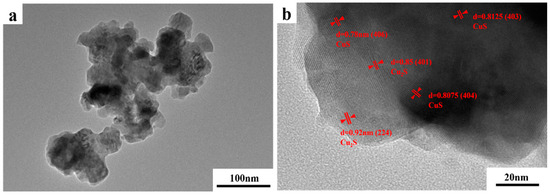 TEM images of the photodecomposition products are shown in Figure 11a. The products were spherical granular structures with different particle size distributions. The powders agglomerated and exhibited poor dispersion. Given the scale of the figure, most particles were within the 50–200 nm diameter range, which is consistent with the nanoscale. In Figure 11b, “d” represents the lattice spacing of decomposition products. The lattice spacings of 0.78, 0.8075, and 0.8125 nm corresponded to the crystal faces of the CuS cubic phases (406), (404), and (403), respectively. The lattice spacings of 0.86 nm and 0.92 nm corresponded to the (401) and (224) crystal faces of the Cu2S cubic phase, respectively. This indicates that the thiosulfate complexes in the extraction solution decomposed under UV irradiation and produced a precipitate containing CuS and Cu2S nanoparticles.