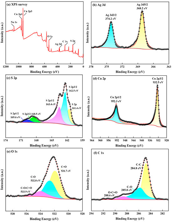 The XPS spectra in Figure 12a indicate the coexistence of Ag, S, Cu, O, and Na. In the high-resolution XPS spectrum of Ag 3d (Figure 12b, contaminated carbon internal standard C 1s: 284.8 eV), the two broad independent peaks at 368.2 and 374.2 eV were attributed to Ag2S and Ag 3d3/2, which are associated with silver sulfide groups [37]. This indicates that Ag components existed as Ag2S and Ag on the surface of the photoproducts. The spectrum shown in Figure 12c reveals that S 2p had two peaks in the detection range. The S 2p peaks were characterized by S 2p3/2 and S 2p1/2 double peaks. The binding energy values shown in the figure are generally consistent with those reported in the literature for Ag 3d and S 2p as silver sulfide [38]. Furthermore, the binding energy of 162.5 eV may be attributable to Cu2S 2p3/2 and CuS 2p3/2, whereas, at 163.4 eV, it may be attributable to Ag2S 2p1/2 and S0. The junction energies of 168.5 and 169.6 eV may be attributable to Na2S2O3 2p3/2 and Na2S2O3 2p1/2. Additionally, the Cu 2p peak was observed in the photolytic products (Figure 12d). The binding energy of Cu 2p3/2 was found to be 932.5 eV, which is consistent with the Cu ion in the literature and may be attributable to Cu2S; moreover, the binding energy of Cu 2p1/2 was found to be 952.3 eV, possibly attributable to CuS and Cu2S [39]. Figure 12e shows the spectrum of O 1s with binding energies of 531.7, 532.8, and 533.9 eV, which are peaks associated with C=O, C-O, and C-O-C=O groups, respectively [40]. Figure 12f shows the spectrum of C 1s, in which the peaks at binding energies of 284.8, 285.8, and 288.6 eV correspond to C-C, C-O, and O-C=O groups, respectively [41].