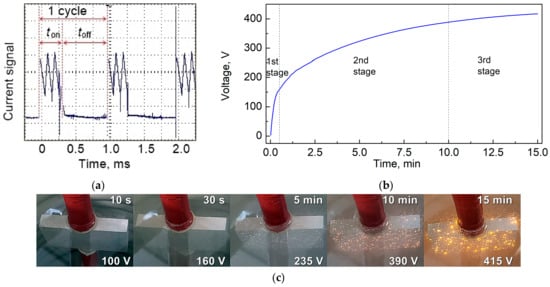 PEO process: (a) shape of a single current pulse; (b) voltage–time curve; (c) appearance of the sample during the process.