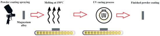 The powder composition obtained was applied to magnesium alloy samples (without and with conversion layer) using an electrostatic gun PEM X-1 controlled by EPG Sprint X (CORONA) (Wagner, Altstäten, Switzerland). Then, the powder coating was melted at 150 °C for 5 min and immediately cured for 42 s using a UVC-5 Compact Light-Curing Conveyor System equipped (Dymax, Wiesbaden, Germany) with a mercury lamp with a power of 850 W. The stages of powder coating production are schematically illustrated in Figure 2.