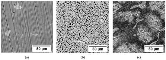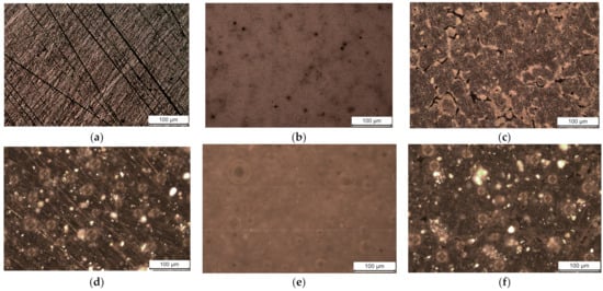 Analyzing the images obtained from an optical microscope of the uncoated AZ91 magnesium alloy, one can notice clear scratches created during the grinding process (Figure 3a). After the alloy surface is anodized in the PEO process, a ceramic coating with external pores is visible. Additionally, darker longitudinal areas can be distinguished in the coating, which are probably oxidized places in the more noble β-phase (Mg17Al12) of the AZ91 alloy (Figure 3b). The surface of the magnesium alloy after chemical conversion does not show visible scratches on the untreated alloy. Furthermore, the appearance of dendritic structures and local cavities can be observed, indicating that a surface modification process has occurred (Figure 3c). In Figure 3d–f, which show the produced UV-cured organic coatings, in all cases spherical areas (i.e., fish eyes) can be seen, indicating the surface imperfection of the powder coatings produced. Because of the transparency of the organic coating, the photos also partially show the structure of the magnesium substrate or the conversion subcoatings.