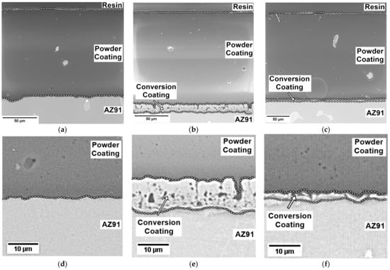 Regardless of the conversion coating employed (or its absence), the organic coating is characterized by excellent adhesion to the magnesium substrate and exhibits a continuous structure with no visible delamination, cracks, or gaps between layers. Because of the transparency of the powder coating, small impurities are visible in the volume of the layer. The conversion coating produced in the PEO process (Figure 5e) has a characteristic structure consisting of an outer, thick, and porous layer and an inner, thin, and compact barrier layer. The powder coating applied to this layer fills the open pores of the conversion layer. In the case of a chemically produced conversion coating, the layer is thin and has cracks.