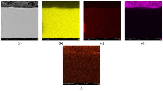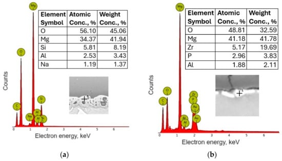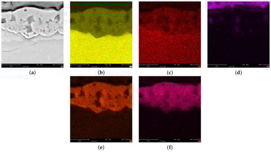 Elemental analysis of the cross-section of the AO sample indicates that the substrate is the alloy consisting of magnesium and aluminum. Aluminum enrichment is visible at the left edge of the image (β-phase fragment) (Figure 6a,c). The powder coating consists of carbon. Small amounts of oxygen (Figure 6e) are visible at the substrate–coating interface, probably from local oxidation of the magnesium alloy in air, before the formation of the organic coating. In the case of the APO coating (Figure 7), between the magnesium substrate and the organic coating, there is a visible conversion layer composed of magnesium and aluminum (which comes from the alloy) and oxygen and silicon (which comes from the electrolyte bath used in the PEO process). Based on reports in the literature, it can be concluded that the resulting conversion coating consists mainly of MgO and SiO2, which may partially combine due to the extreme high temperature in the discharge channel in the plasma process to form Mg2SiO4 [,,]. The cross-section of the ACO coating (Figure 8) exhibits a thin conversion layer enriched with oxide, zirconium, and phosphorus—constituents derived from the chemical conversion bath. In the case of the zircon phosphating magnesium alloy, the presence of Mg3(PO4)2 or MgHPO4·3H2O and ZrO2 can be expected [,,]. Both conversion baths contained fluorine (in the form of NaF or H2ZrF6), making it possible to include it in the structure of the conversion coating, but due to the limitations of the analytical method used, its presence was not detected.