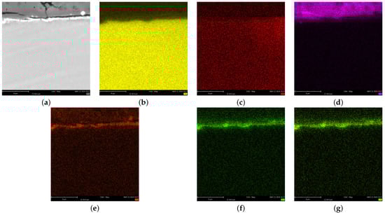 The elemental distribution in the cross-section of the ACO coating: (a) SEM image; EDS mappings of (b) Mg, (c) Al, (d) C, (e) O, (f) Zr, (g) P.