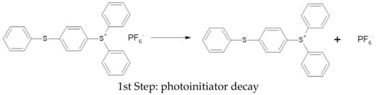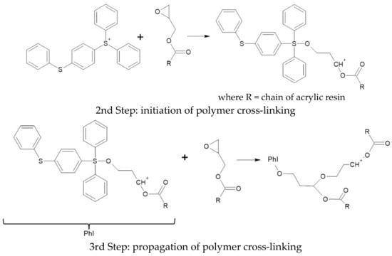 In the UV-curing process used, the key issue is the presence of an epoxy group in the acrylic resin, thanks to which the cationic polymerization (cross-linking) reaction of the resin is possible. The polymerization reaction scheme is shown in Figure 11.