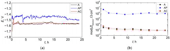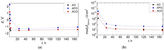 Results of the electrochemical measurements of AO, APO, and ACO coatings: (a) open circuit potential; (b) impedance modulus at 20 mHz.