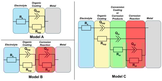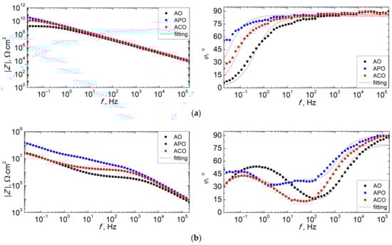 In the initial immersion time (3 h), all samples showed high impedance values (109–1010 Ω·cm2), which means that the organic coating acted as an insulating layer and provided good protective properties. A simple circuit with one capacitive loop was used to analyze the impedance data for an intact organic coating, which included the solution resistance (Rs), the coating capacitance (Qtop), and the coating resistance (Rtop) (model A). Because of the scattering effect caused by the heterogeneity of the coating surface, the constant phase element (Q) was used to replace the capacitance element []. The solution resistance, according to calculations, is equal to 12–18 Ω·cm2, but the impedance modulus at high frequencies does not reach this value (Figure 14). The values of the phase angle close to 90° at high and middle frequencies, as well as high values of the power n of the constant phase elements (Table 3), indicate the capacitive character of the Q element. The APO sample had the highest total resistance (41.0 GΩ·cm2); then, the smaller ACO sample (12.5 GΩ·cm2) and the lowest value were obtained for the AO sample (1.6 GΩ·cm2). The same sequence can be observed for the |Z|20mHz value (APO > ACO > AO).